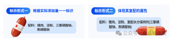 复配食品添加剂应展开标示其在终产品中发挥作用的全部食品添加剂。可以根据实际添加量一一标示;也可以采用体现食品添加剂复配属性的方式进行标示,即标示复配添加剂的名称,再在其后用括号的形式展开标示每种食品添加剂。如下图。